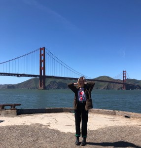 I wore simple loose blue Levi jeans which you can’t see in this picture. Recreating this look with any blue jeans will do the trick. I wore a Brandy Melville turtleneck I bought a few months ago, paired with a blue Adidas bucket hat from Urban, and some gold jewelry that I found at forever 21. These are all items that are very trendy and also fit the theme because they were also popular a few decades ago as well.