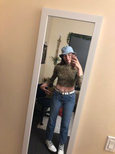 I decided to also add a brandy Melville cheetah turtleneck, the pattern of cheetah used is one that is commonly found on many Brandy pieces, I feel the turtleneck is one of the cuter styles for that pattern. I ended the look with my light blue Adidas bucket hat, found at Urban Outfitters around a little less than a year ago.
